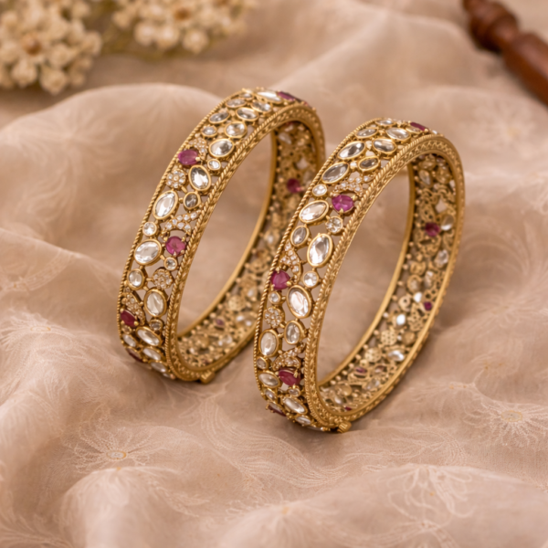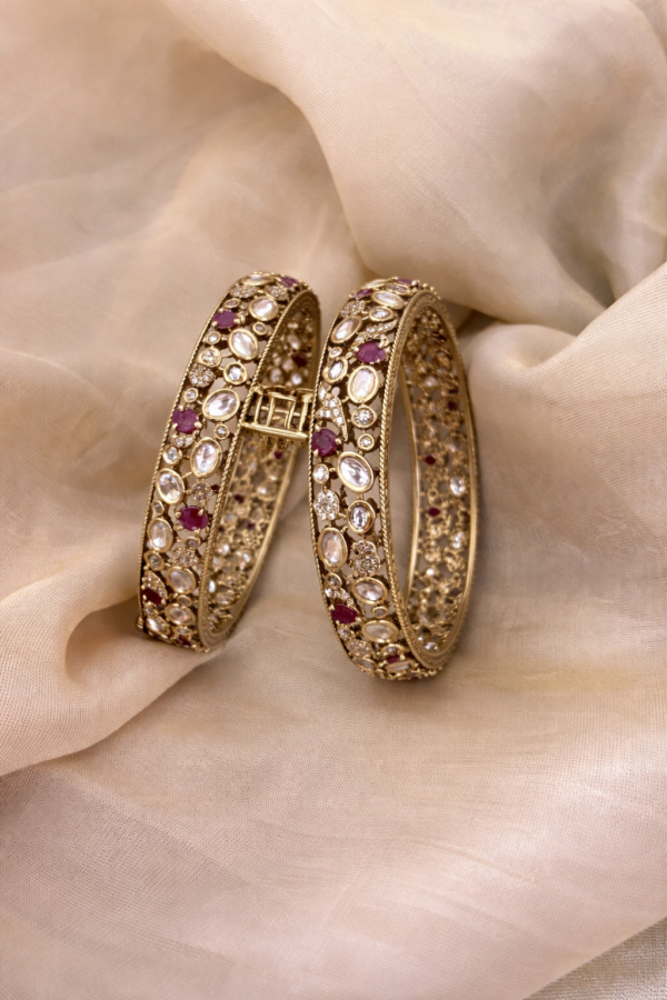 Designed for the modern bride who cherishes heritage, these exquisite Ruby Kangans blend royal tradition with contemporary grace. Featuring a stunning arrangement of oval-cut ruby stones paired with shimmering clear Kundan accents, each bangle is meticulously handcrafted in an intricate open-work gold frame for a luxurious finish.