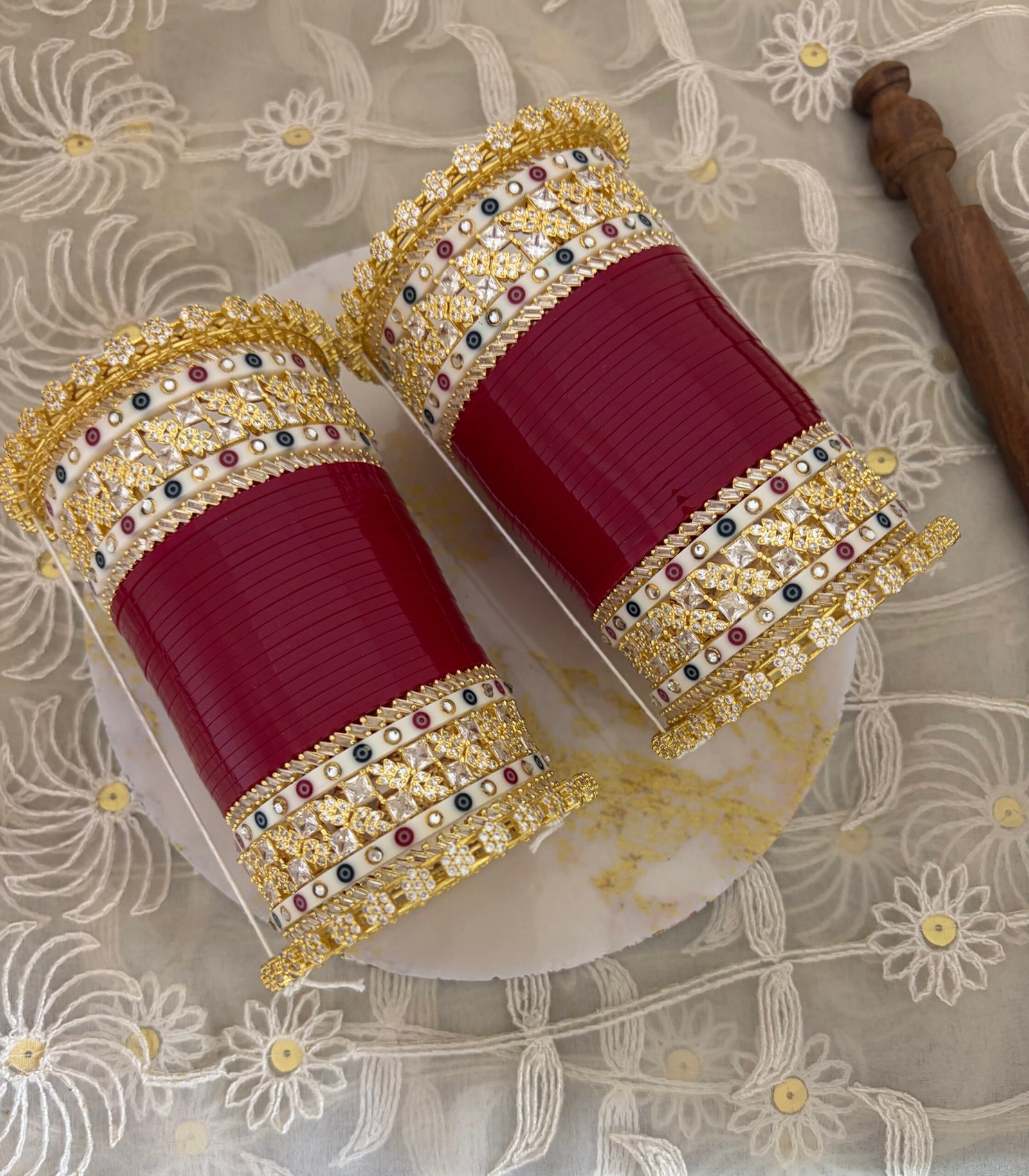 A perfect blend of contemporary luxury and traditional bridal charm, this chura is made to stand out with its unique color palette, premium finish, and rich detailing.