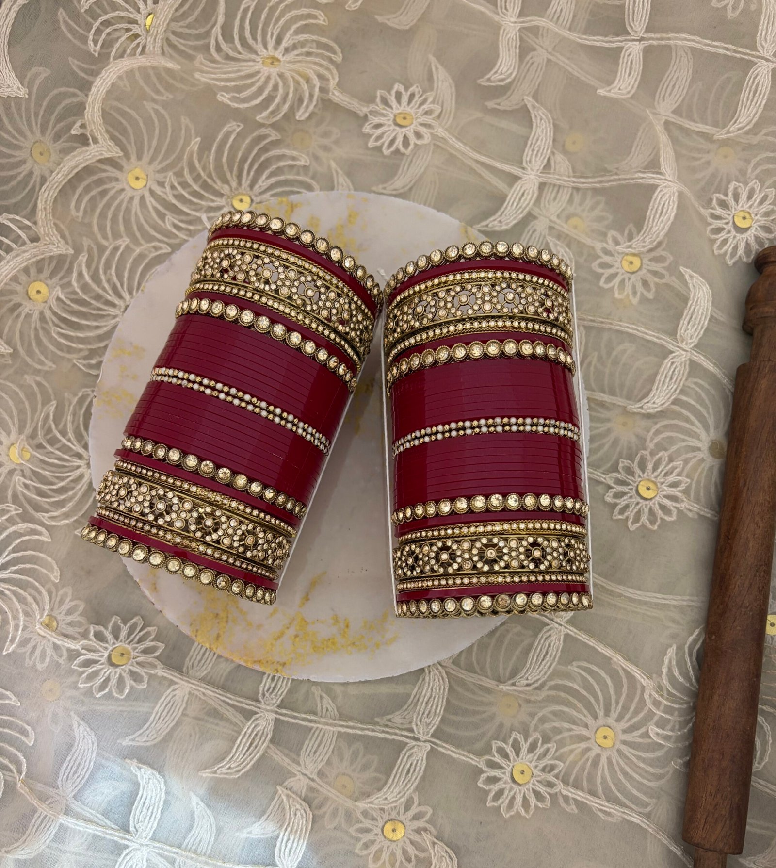 With its vintage charm and regal appeal, this bridal chura is perfect for brides who love high-contrast traditional patterns and standout elegance.