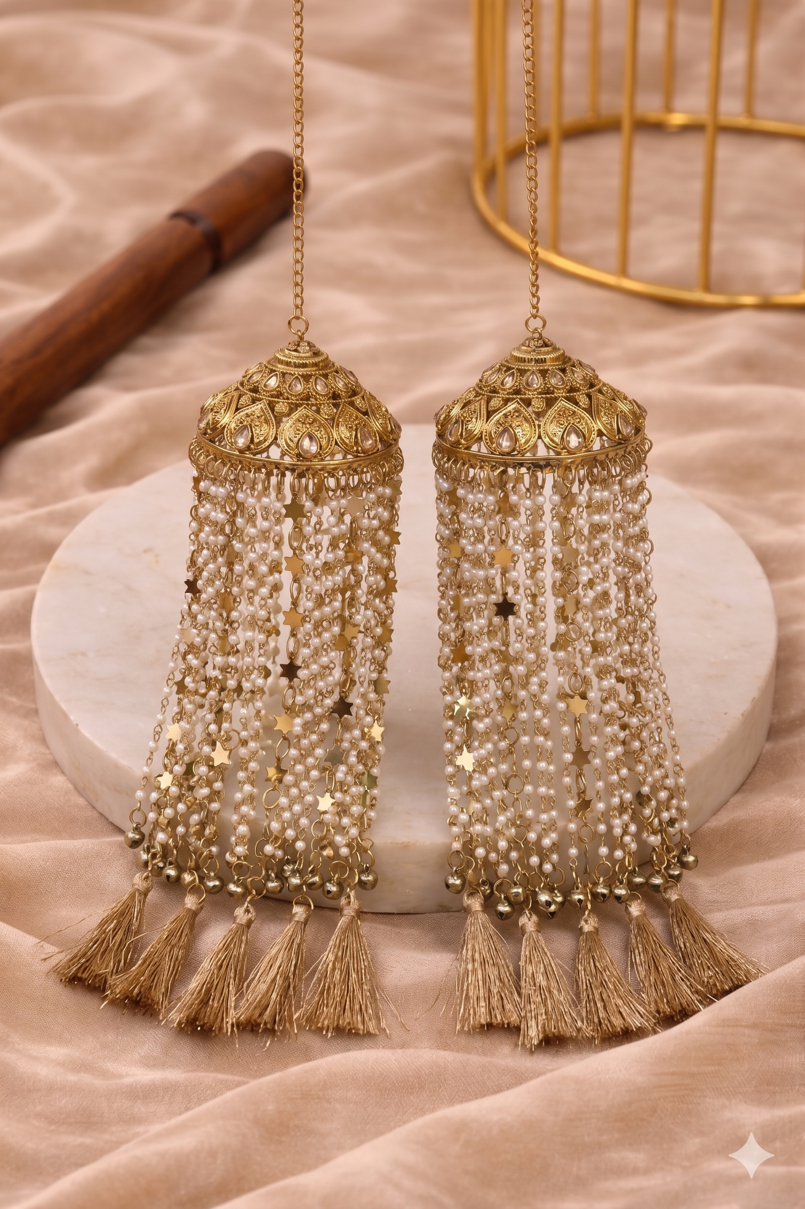 Add a touch of royalty to your bridal look with our Royal Kalira, designed to make your special day even more memorable. Featuring intricate traditional craftsmanship, elegant layered domes, delicate chains, and beautifully hanging charms, this kalira creates a graceful and luxurious bridal statement. Its premium finish and rich detailing perfectly complement bridal chura and wedding attire.